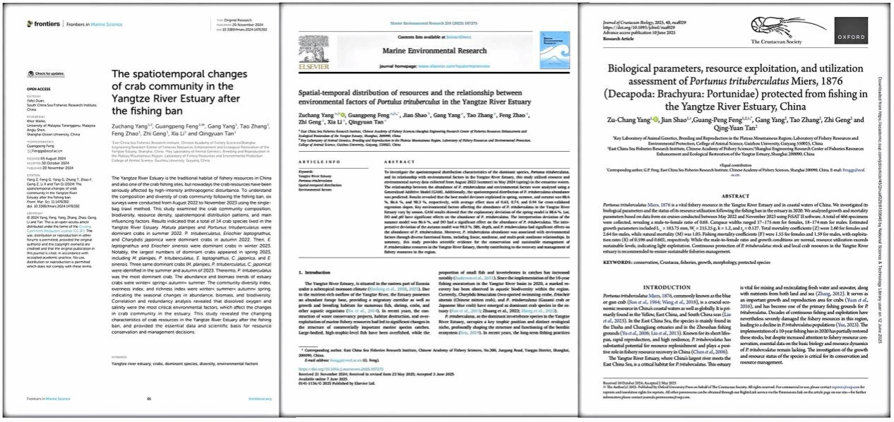 近日,我所长江口渔业生态创新团队近期在长江口蟹类群落变化、生物学特征、时空分布规律等方面的研究取得新进展。相关研究成果在SCI期刊《Frontiers in Marine Science》《Marine Environmental Research》和《Journal of Crustacean Biology》刊载。我所与贵州大学联合培养的硕士研究生杨祖长为第一作者,冯广朋研究员为通讯作者。